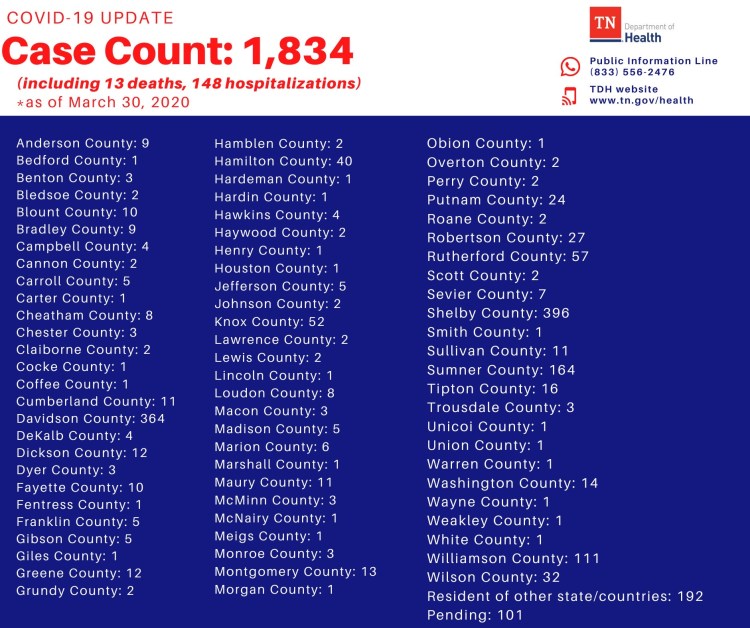 As of this writing, I have been notified by the TN Department of Health (TDH) that eleven residents of Cumberland County have tested positive for COVID-19, the novel coronavirus. Contact tracing is standard in all cases, so if you have been in close contact with someone that has tested positive, you will be notified. That is all the information that has been released at this time.