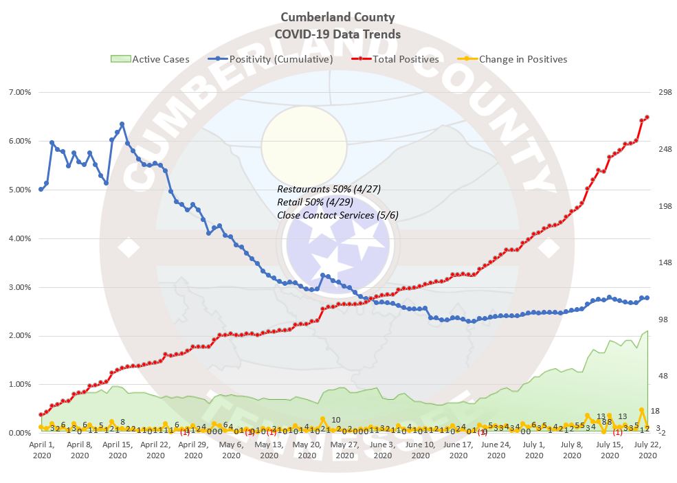 The state has a new map available that gives a little more data by zip code. To get to the map, click here: https://www.tn.gov/health/cedep/ncov/data/maps.html, then select the “Recent trends by Zip Code” tab and select “Upper Cumberland Region” to see the 21-Day Testing and Case Rates for various zip codes.