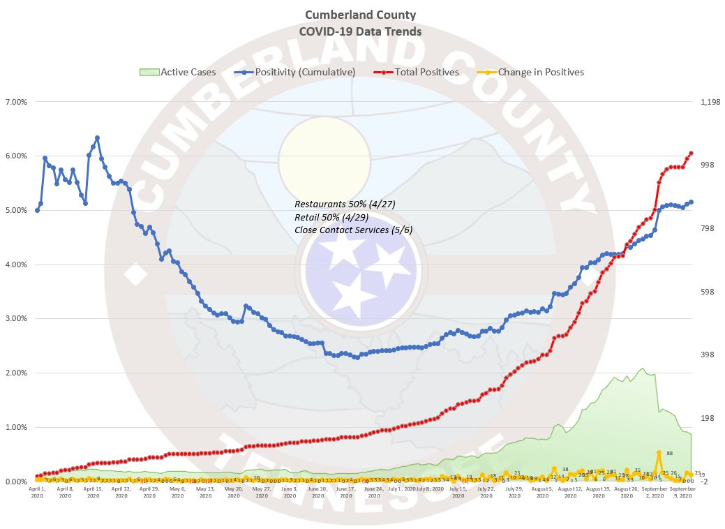 The following are the numbers from the Tennessee Department of Health (TDH) for Cumberland County as of 2:00 PM today. The change from the prior day is in parenthesis.