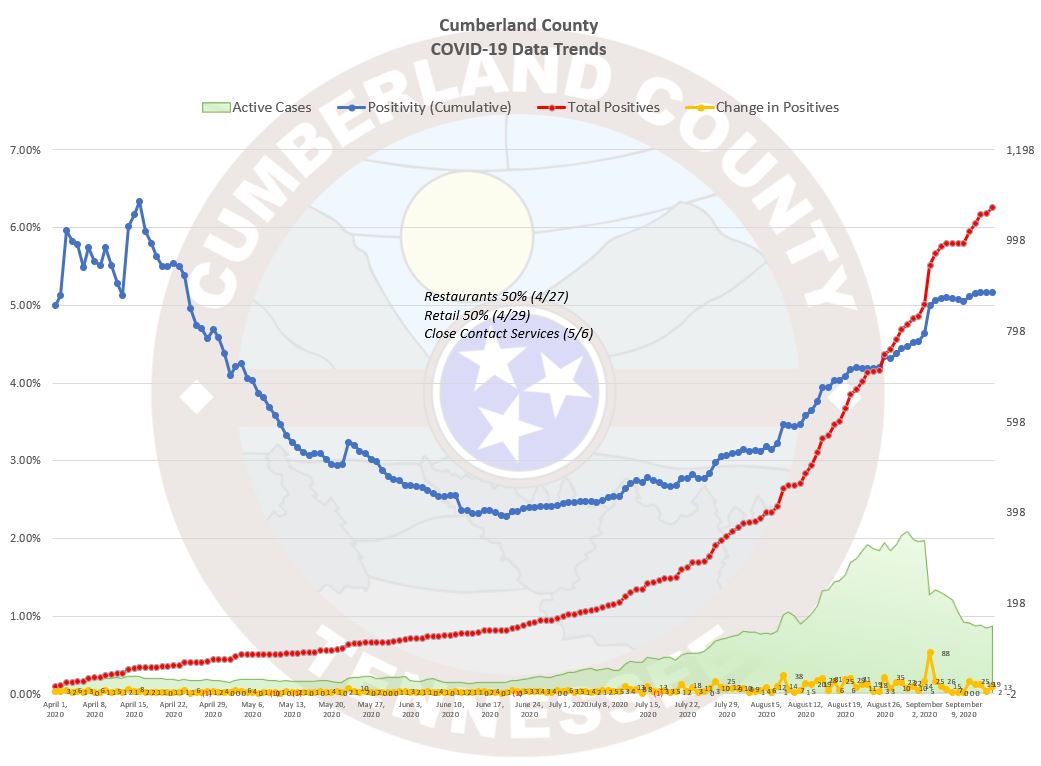 The following are the numbers from the Tennessee Department of Health (TDH) for Cumberland County as of 2:00 PM today. The change from the prior day is in parenthesis.