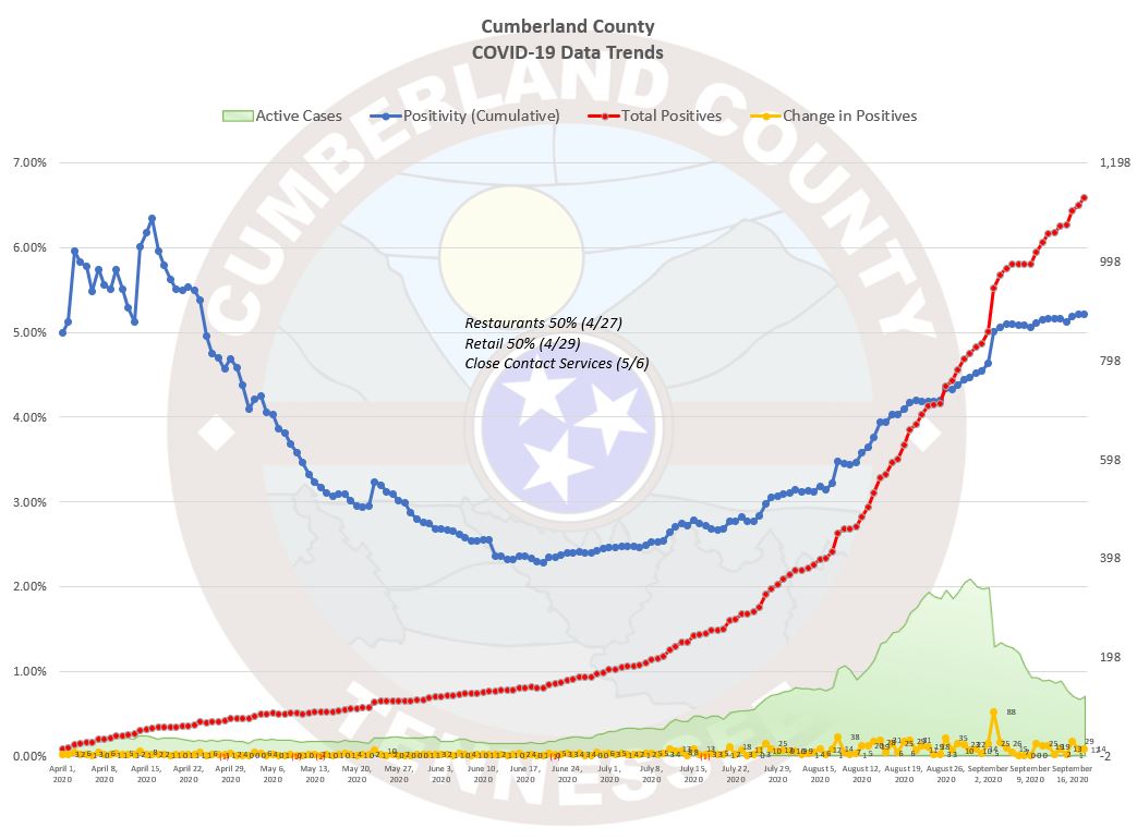 The following are the numbers from the Tennessee Department of Health (TDH) for Cumberland County as of 2:00 PM today. The change from the prior day is in parenthesis.