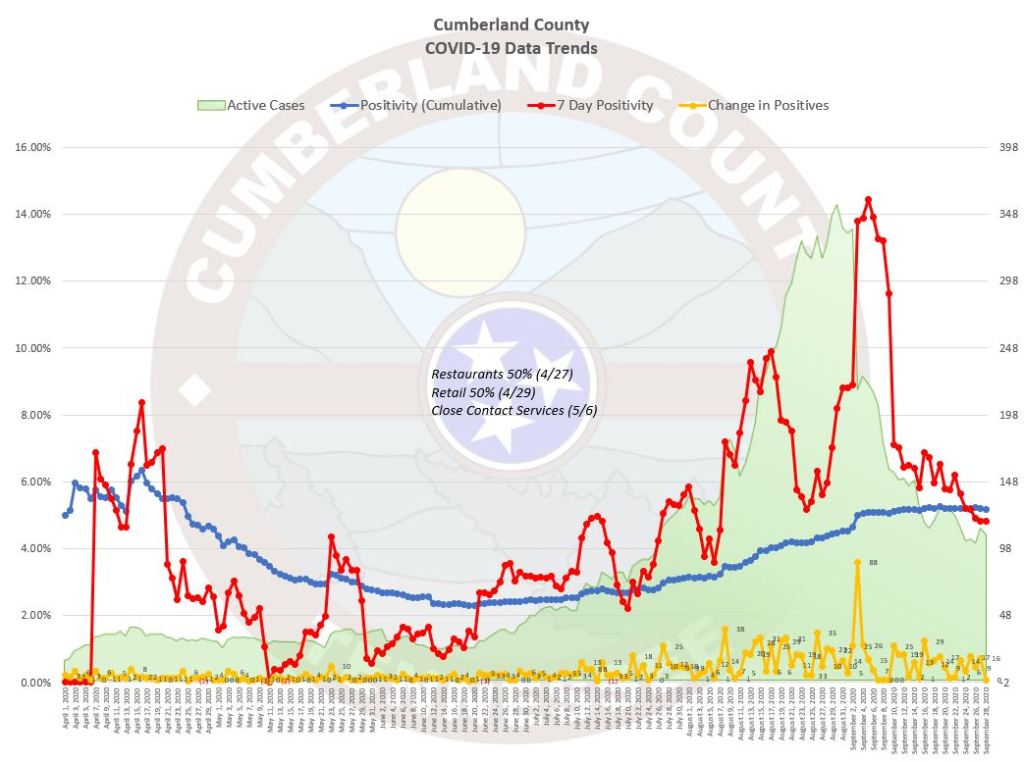 The following are the numbers from the Tennessee Department of Health (TDH) for Cumberland County as of 2:00 PM today. The change from the prior day is in parenthesis.