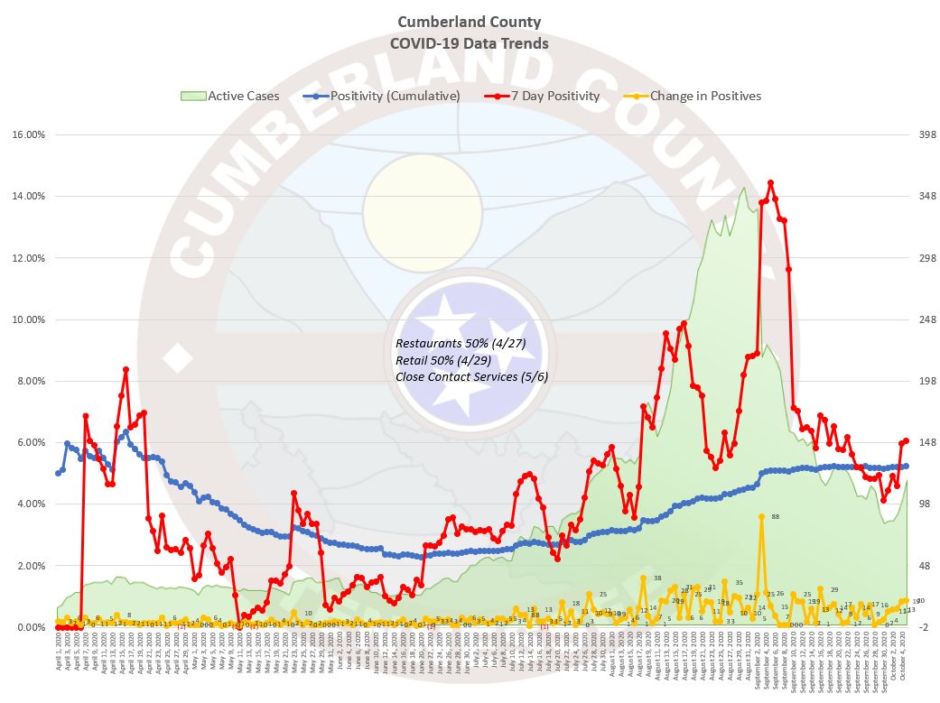 The following are the numbers from the Tennessee Department of Health (TDH) for Cumberland County as of 2:00 PM today. The change from the prior day, not my prior newsletter, is in parenthesis.