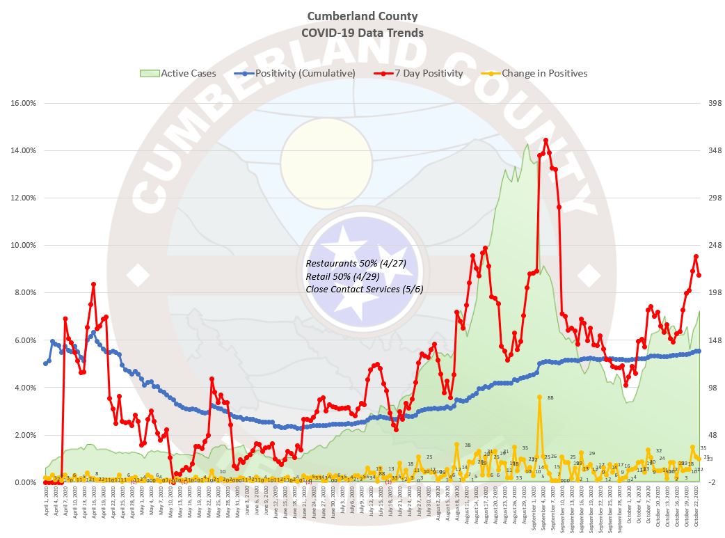The following are the numbers from the Tennessee Department of Health (TDH) for Cumberland County as of 2:00 PM today. The change from the prior day, not my prior newsletter, is in parenthesis.