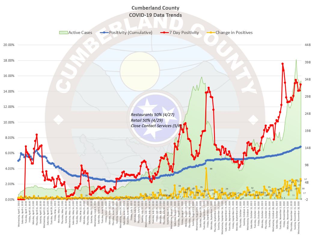 The Tennessee Department of Health and Tennessee National Guard will extend operating hours at the Cumberland County Health Department, from 7 a.m. to 5 p.m. on Monday, November 23, and Monday, November 30 ONLY. All 89 rural county health departments, including the one in Cumberland County, will be open Monday, November 23, through Wednesday, November 25. County health departments will be closed and will not provide COVID-19 testing from Thursday November 26, through Saturday November 28, 2020.