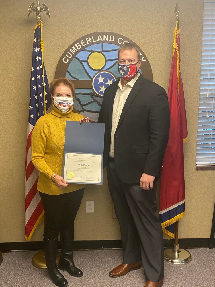 Beth Wyatt-Davis, my Office Manager, has completed the County Administrative Professional Certificate administered by the County Technical Assistance Service, an extension of the University of Tennessee. The County Administrative Professional Certificate is designed for individuals who want to develop skills for a variety of job functions or professional growth in county government offices. Participants earn this certificate upon completion of the required sixteen (16) courses for a total of seventeen (17) credits. The program consists of a variety of topics related to technology, communication, and interpersonal skills.