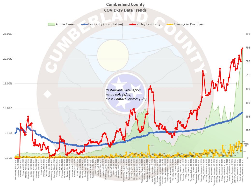The following are the numbers from the Tennessee Department of Health (TDH) for Cumberland County as of 5:00 PM (the state has permanently changed the time to 5:00 PM for the data release). The change from the prior day, not my prior newsletter, is in parenthesis.