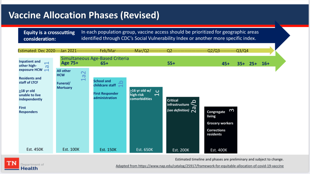 We have discussed how Cumberland County has one of the 89 Health Departments ran by the State of Tennessee. On Wednesday, December 30, 2020, the local Health Departments found out during Governor Lee’s press conference that Tennessee would begin simultaneous age-based vaccinations coinciding with the previously released vaccine allocation phases (see graphic below). This change was in effect for the coming Saturday, January 2, 2021. That meant seniors ages 75 and older could get vaccinated sooner than originally anticipated.