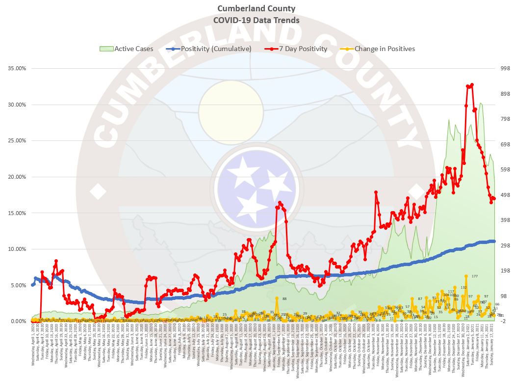The following are the numbers from the Tennessee Department of Health (TDH) for Cumberland County as of the date of this newsletter. The change from the prior day, not my prior newsletter, is in parenthesis.