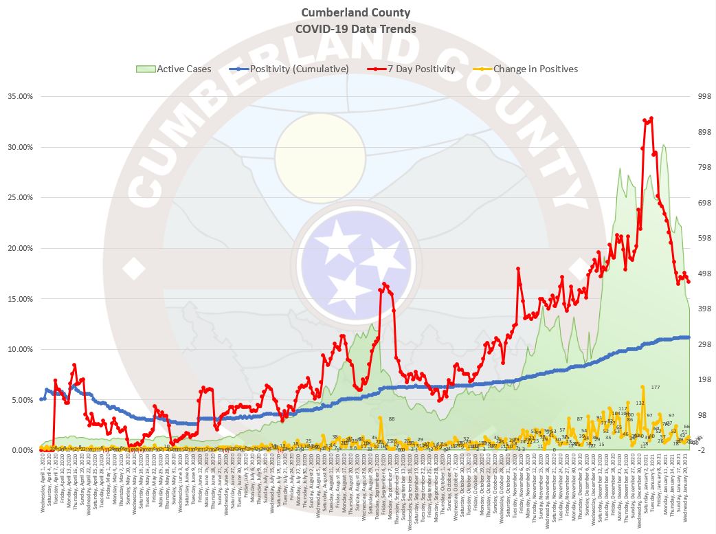 The following are the numbers from the Tennessee Department of Health (TDH) for Cumberland County as of the date of this newsletter. The change from the prior day, not my prior newsletter, is in parenthesis.
