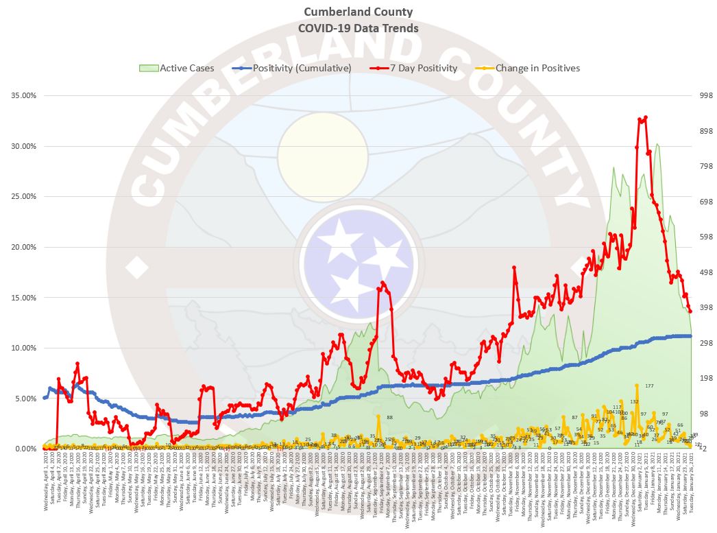 The following are the numbers from the Tennessee Department of Health (TDH) for Cumberland County as of the date of this newsletter. The change from the prior day, not my prior newsletter, is in parenthesis.