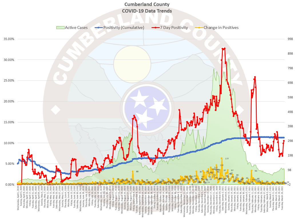 The following are the numbers from the Tennessee Department of Health (TDH) for Cumberland County as of the date of this newsletter. The change from the prior day, not my prior newsletter, is in parenthesis.