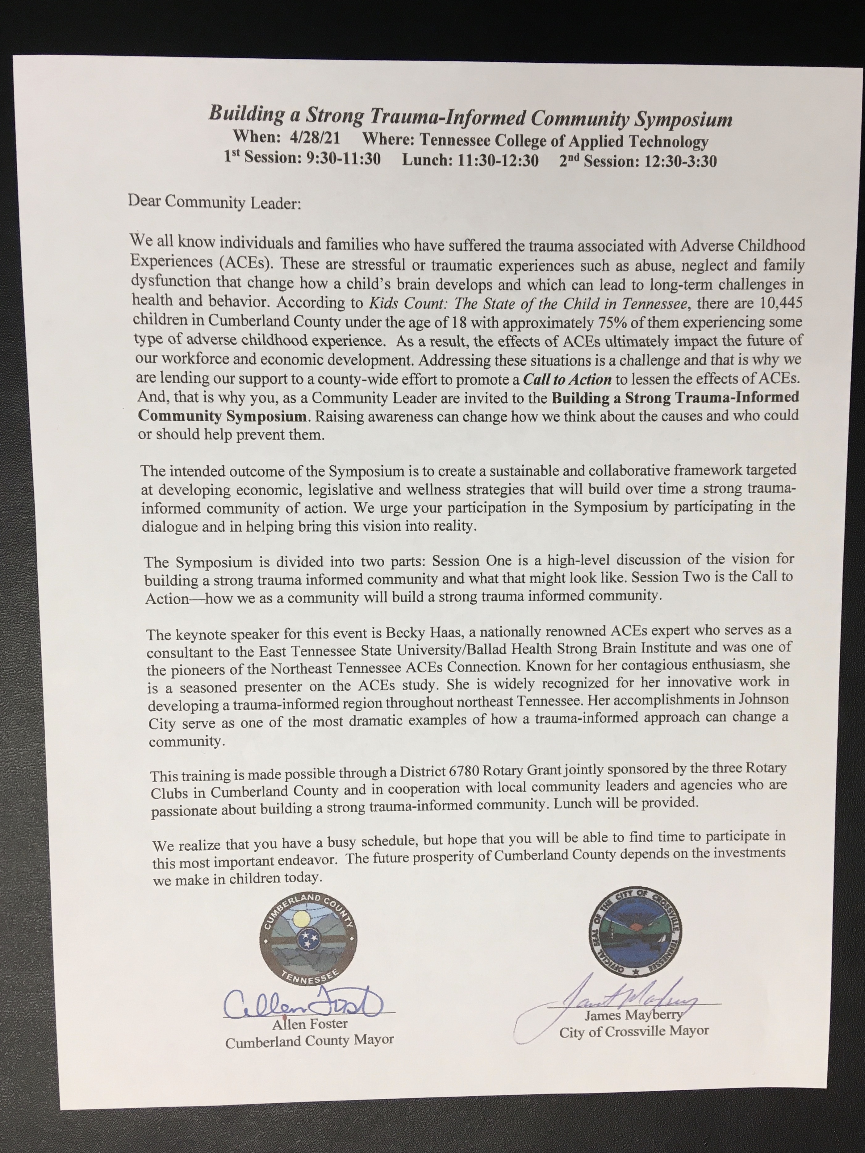 We all know individuals and families who have suffered the trauma associated with Adverse Childhood Experiences (ACEs). These are stressful or traumatic experiences such as abuse, neglect and family dysfunction that change how a child’s brain develops and which can lead to long-term challenges in health and behavior. As a result, the effects of ACEs ultimately impact the future of our workforce and economic development. Addressing these situations is a challenge and that is why Crossville Mayor Mayberry and I are lending our support to a county-wide effort to promote a Call to Action to lessen the effects of ACEs.