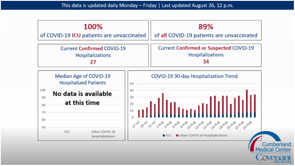 CMC and Covenant released a dashboard with information about current COVID-19 patients. You can see from the graphic that 100% of all COVID-19 ICU patients at CMC are unvaccinated, and 89% of all COVID-19 patients at CMC are unvaccinated. Currently there are 34 confirmed or suspected COVID-19 hospitalizations at CMC.