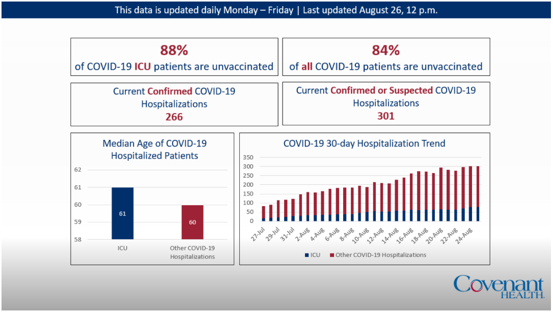 Covenant also released data for the hospital system as a whole. You can see from the graphic that 88% of all COVID-19 ICU patients in a Covenant hospital are unvaccinated, and 84% of all COVID-19 patients in a Covenant hospital are unvaccinated. Currently there are 301 confirmed or suspected COVID-19 hospitalizations in a Covenant facility. The median age of those in the ICU is 61 and the median age of all COVID-19 hospitalizations is