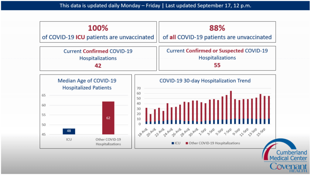 CMC and Covenant released a dashboard with information about current COVID-19 patients. You can see from the graphic that 100% of all COVID-19 ICU patients at CMC are unvaccinated, and 88% of all COVID-19 patients at CMC are unvaccinated. Currently there are 55 confirmed or suspected COVID-19 hospitalizations at CMC. At CMC, the median age of those in the ICU is 48 and the median age of all COVID-19 hospitalizations is 62.