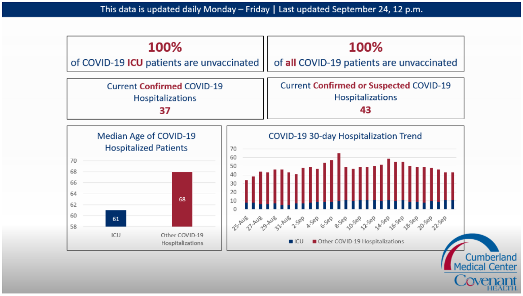 CMC and Covenant released a dashboard with information about current COVID-19 patients. You can see from the graphic that 100% of all COVID-19 ICU patients at CMC are unvaccinated, and 100% of all COVID-19 patients at CMC are unvaccinated. Currently there are 43 confirmed or suspected COVID-19 hospitalizations at CMC. At CMC, the median age of those in the ICU is 61 and the median age of all COVID-19 hospitalizations is 68.