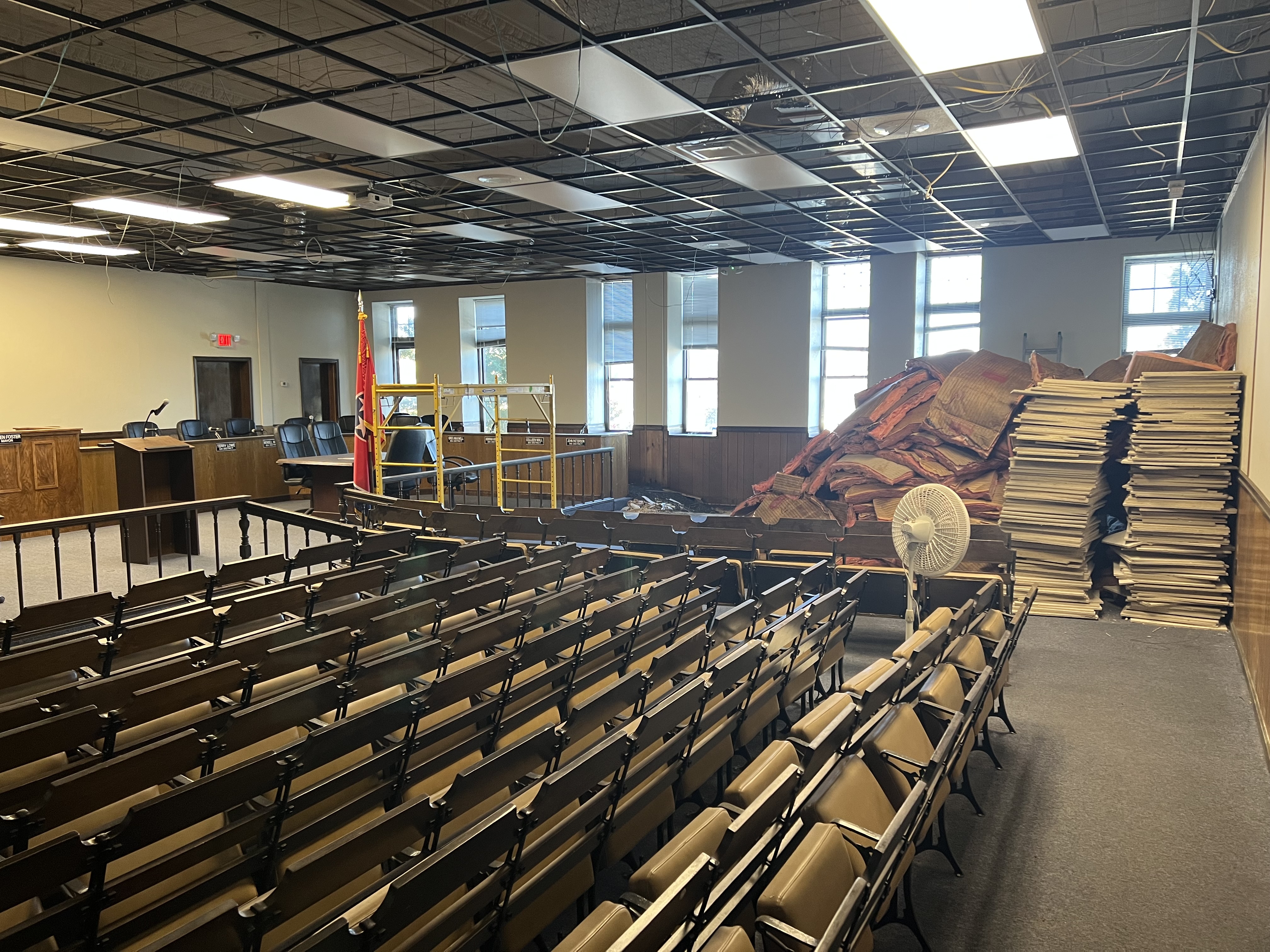 As mentioned previously, a water leak led to the discovery of structural damage in the large courtroom of the old courthouse downtown. An inspection by a structural engineering firm found three of the large oak roof trusses have damage, rendering the original 1905 section of the building dangerous and resulting in the need to close that section to the public. The three doors to that section (Main Street, and the two on each side) are closed until further notice.