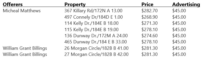 RESOLUTION 12-2022-1 – TO ACCEPT OFFER(S) TO PURCHASE DELINQUENT TAX PROPERTY OWNED BY CUMBERLAND COUNTY (HOLBROOK) The following delinquent tax properties were approved unanimously for purchase and will now go back on the tax rolls.