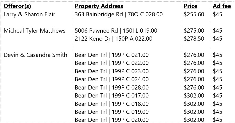 RESOLUTION 04-2023-1 – TO ACCEPT OFFER(S) TO PURCHASE DELINQUENT TAX PROPERTY OWNED BY CUMBERLAND COUNTY (HOLBROOK). The following delinquent tax properties were approved in a 16-0 vote for purchase and will now go back on the tax rolls.
