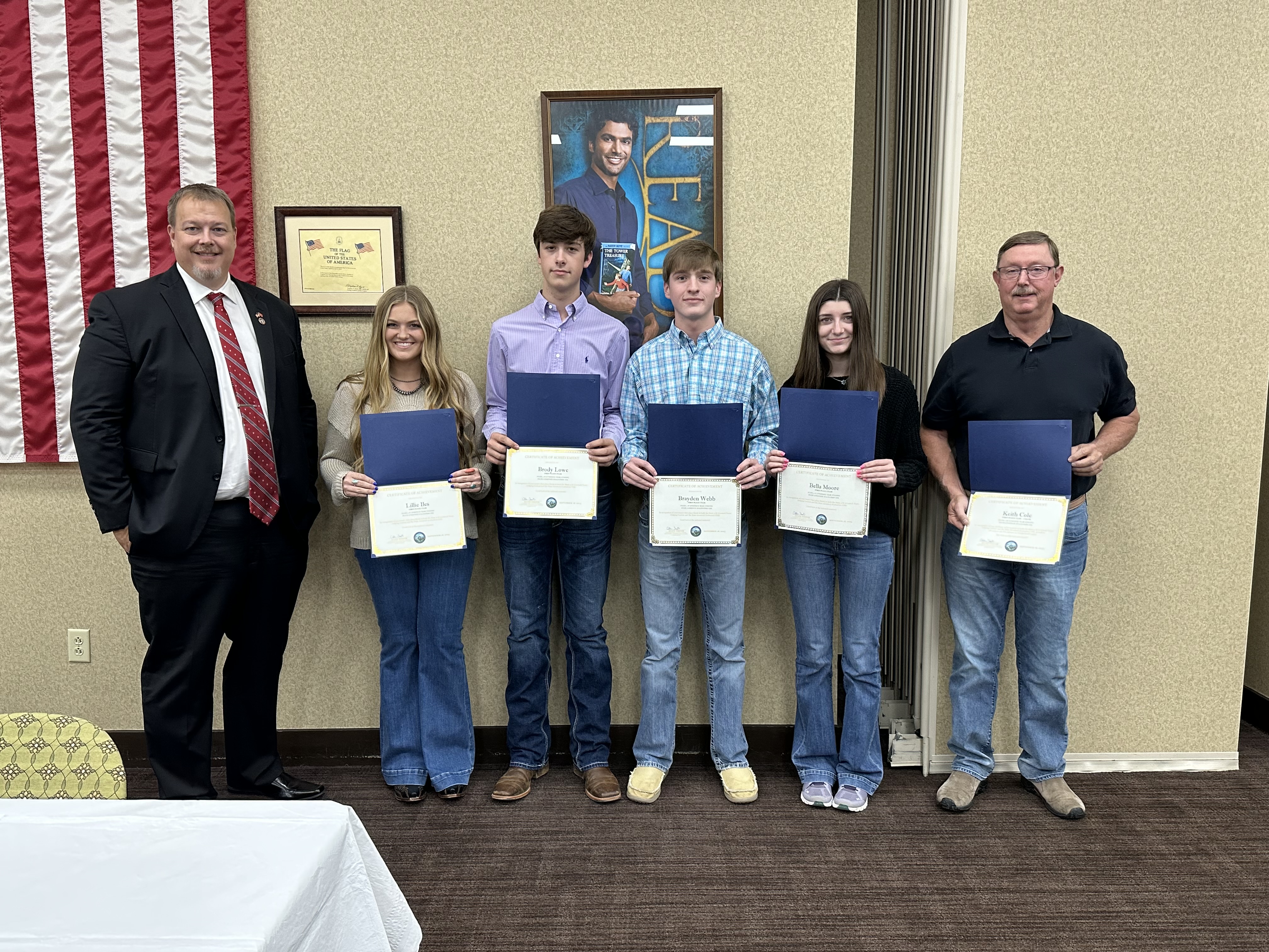 During the special recognition section of the evening, it was my pleasure to recognize the SMHS FFA Livestock Judging team. The team recently placed first in the 4-H State Livestock Judging Contest and the State Livestock Evaluation. We had Brayden Webb, Lillie Illes, Bella More, Brody Lowe, and Coach Keith Cole in attendance. Next up for the team is the National 4-H Livestock Judging Contest that will be held in November in Louisville, KY.