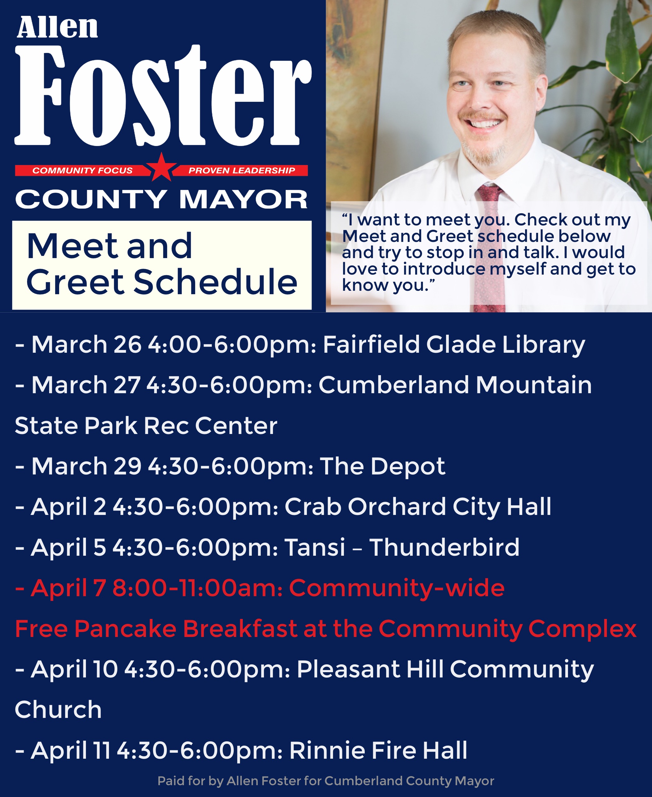 We have been doing Meet and Greets/Coffees since early January. The sixth in the series is coming up next week. All events are FREE, including the county-wide pancake breakfast on April 7! Light refreshments will be served at all other events.